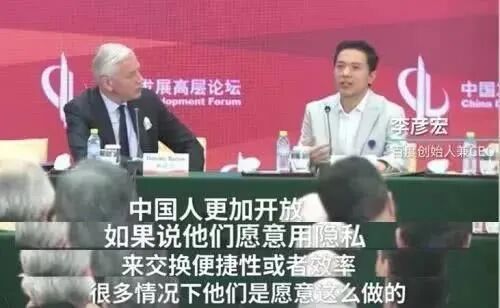 2018年3月26日,中国发展高层论坛上,百度CEO李彦宏在谈及数据泄露和隐私问题时表示:“中国人对隐私问题的态度更加开放,也相对来说没那么敏感。如果他们可以用隐私换取便利、安全或者效率,在很多情况下,他们就愿意这么做。当然我们也要遵循一些原则,如果这个数据能让用户受益,他们又愿意给我们用,我们就会去使用它的。”