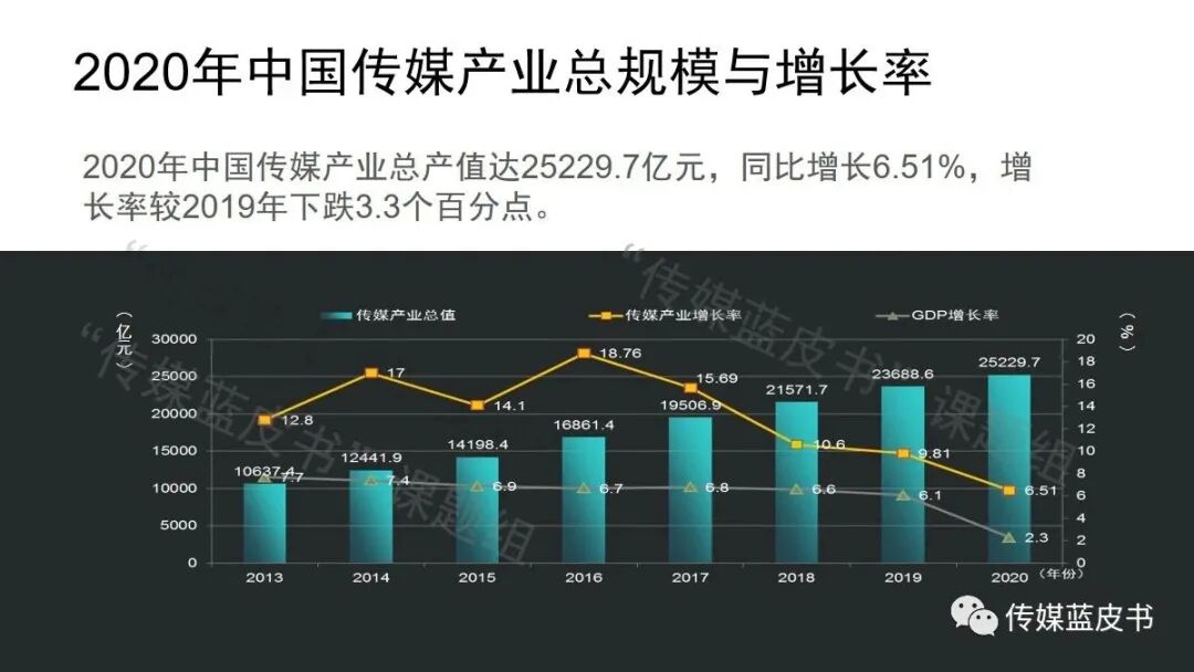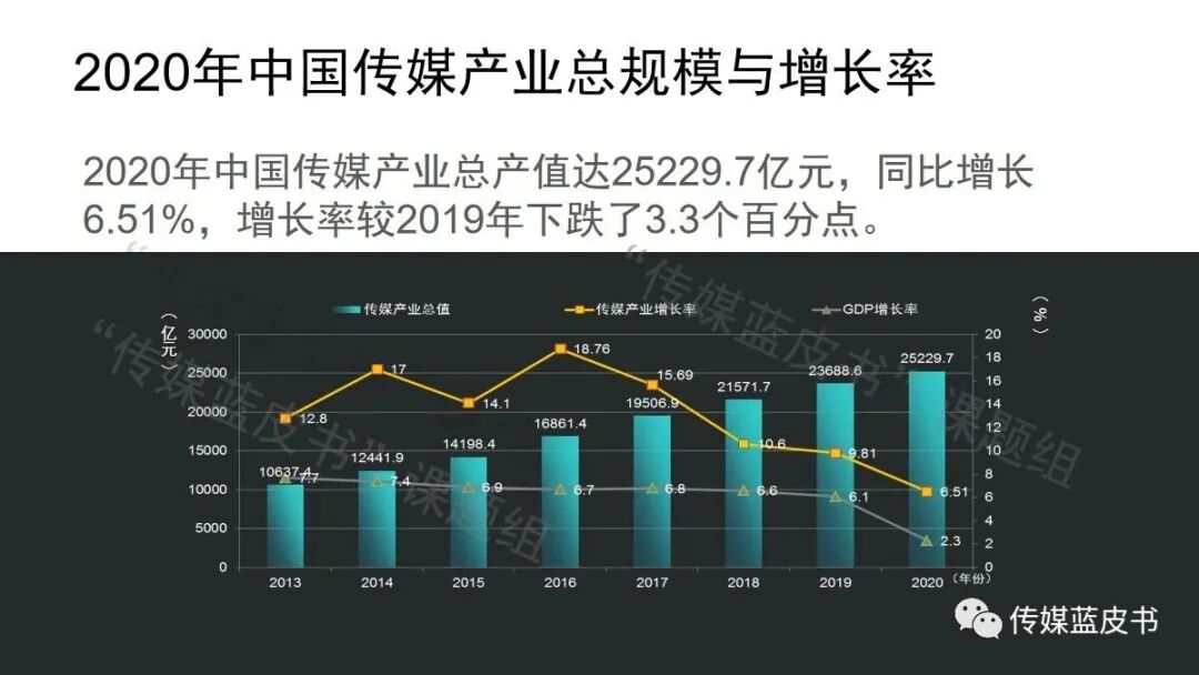 论坛上,清华大学崔保国教授发布了《2021年中国传媒产业发展报告》,并指出:“2020年,受新冠肺炎疫情影响,2020年中国传媒产业的总体规模仍然保持增长,但增速有所下降。中国传媒产业总产值规模达25229.7亿元,较2019年增长6.51%,增长率较2019年下降3.3个百分点,继2019年之后增速连续第二年低于两位数。”