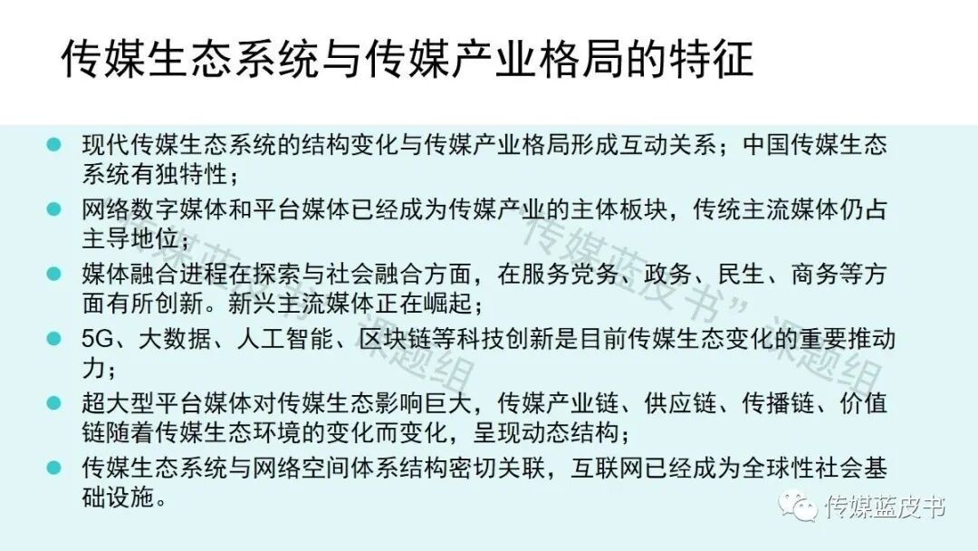 5、超大型平台媒体对传媒生态影响巨大,传媒产业链、供应链、传播链、价值链随着传媒生态环境的变化而变化,呈现动态结构;