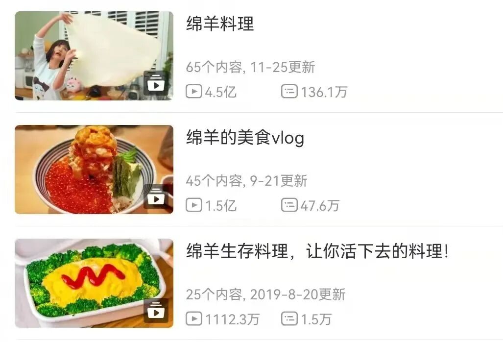 绵羊继续了自己内容迭代的脚步,在2018年底,她尝试拍摄一些美食探店vlog,取得了不错的效果。在经过了这么几年稳定的内容输出后,绵羊成功摸索出一套独树一帜的风格以及内容形式,形成了以绵羊料理、美食探店vlog以及绵羊生存料理为框架的栏目矩阵。