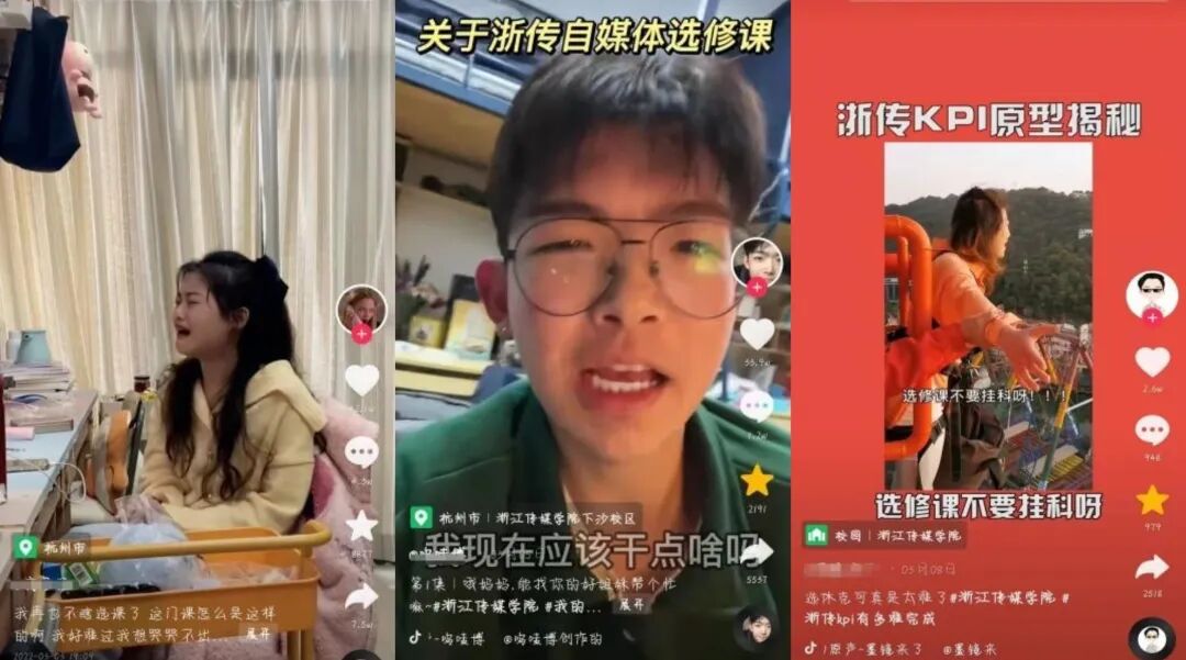 随着话题不断发酵,“浙传学子的KPI有多难完成”冲上了热点榜,“千万不要光看名字选课”登上热搜榜,火爆到让网友感叹:我这是捅了浙传学子的窝吗?!不少学生“蹭”到了选修课的这波热度,只要视频标题带上“浙传学子的KPI有多难完成”的tag,就能轻易收获几万乃至几十万的点赞量。