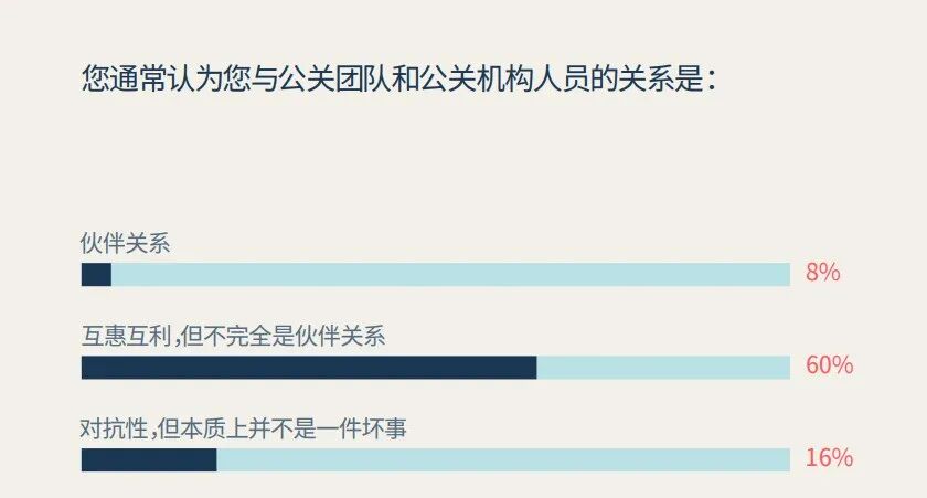 今年,有8%的记者用“合作伙伴”一词来定义自己与公关人员的关系,相比去年,持这种观点的人上升了2%。只有16%的记者认为,“新闻”与“品牌公关”之间的关系是天然对立的。