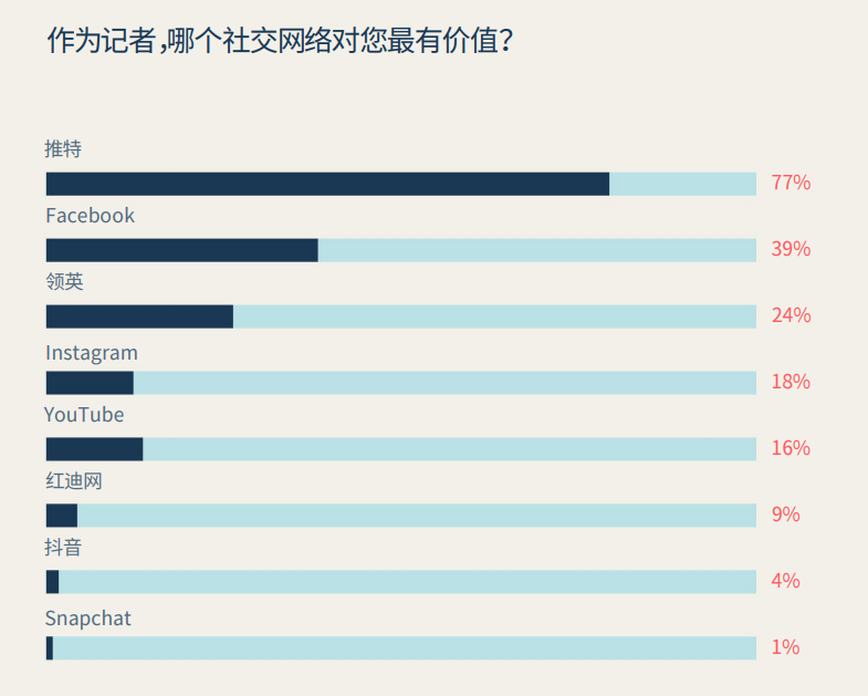 与2021年相比越来越多的记者在社交媒体上寻找新闻线索。60% 的财经记者在报道前会关注相关公司的社交账号,从上面检索出有用的信息。同时,越来越多的记者把网页信息与社交媒体平台当成“第一位”的选题来源渠道。从纸质报纸或杂志中寻找选题的记者已经下降至57%。