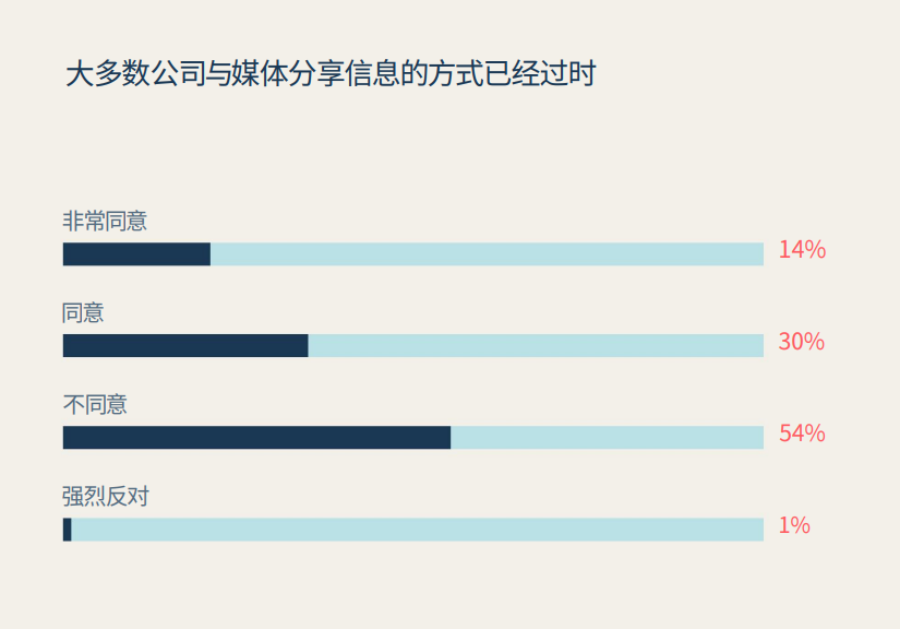 去年,有61%的记者认为企业共享信息的方式已经过时,今年这一比例下降到了44%,这表明企业正在加强信息共享方式。调查显示,在所有领域的记者中,科技与产业类记者认为企业信息共享方式过时的比例最高,其中汽车类记者高达58%。