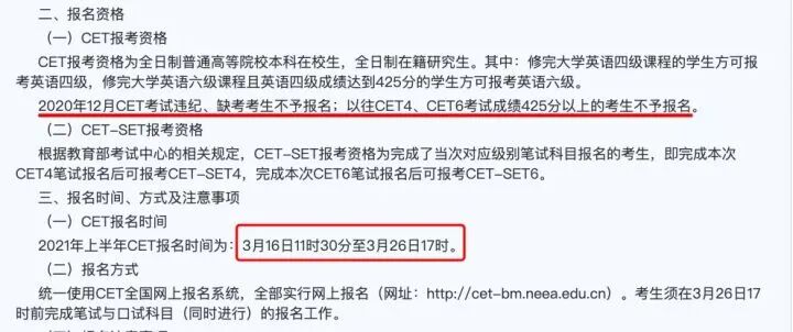 缺考不允许报名:2020年12月CET考试违纪、缺考考生不予报名;