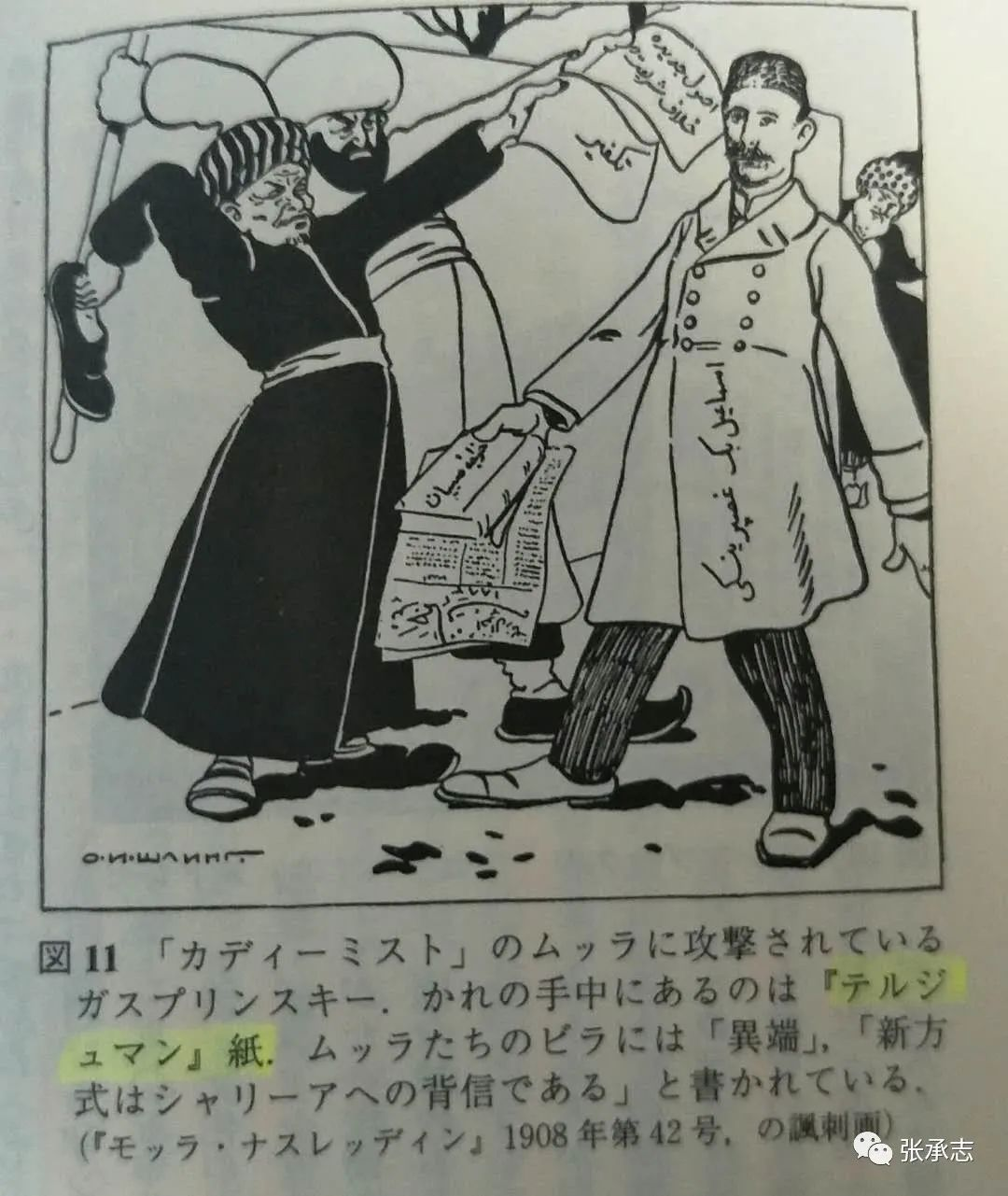 踩着那条半山上的沙石小路,我几趟寻觅,但直觉找不到当年的印刷所了。因为我很了解什么是“迫害者”(kafir,卡费尔),他们把一切都凶恶地毁掉,再无耻地涂得光光。而当年伽斯普林斯基掀起的“新方式”教育,使俄罗斯穆斯林跃出了麦德莱斯(经文学校),并宣示了与教条分子的泾渭两界。它是真正的文化提升,而并非陈旧的“复兴”。不仅有思想而且随之行动,麦德莱斯在启蒙的风暴中成批地被淘汰了。取而代之的“新方式学校”,造就了一代新型知识人——直至今天,中国的穆斯林也没有抵达这一步。能看到一幅宝贵的讽刺画,1908年第42期《毛拉纳斯拉丁》(即阿凡提):伽斯普林斯基手里拿着的报纸上写着“翻译者”,对面一黑一白两个长袍教士是“格迪米斯特”(古典派、老规矩主义者),一个抡着大棒,一个举着鞋子,他们跳着骂着:“卡费尔”(异教徒)!“新方式是对教法的背叛”!![]()