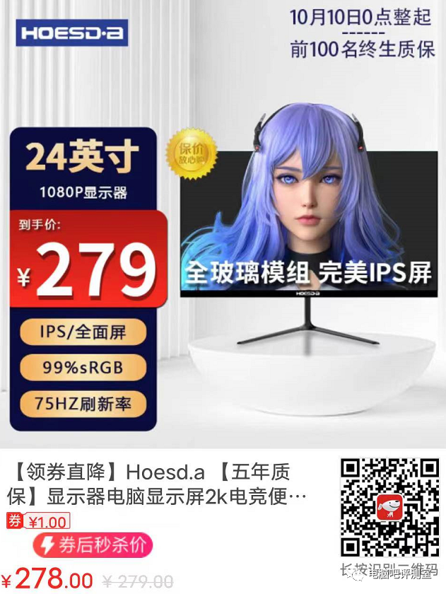 IPS+1080P+75Hz不到300元,很不错了