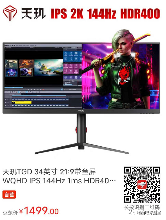 ①. 天玑TGD 34英寸 21:9带鱼屏 WQHD IPS 144Hz 1ms HDR400 旋转升降游戏办公两用显示器 W3408SQK