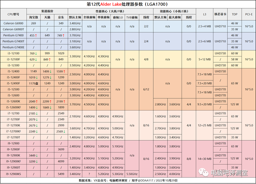 ☞ 第12代i5-12600K/KF处理器(其中K集成UHD770核芯显卡)采用10核16线程设计(6大+4小),满载功耗约100W,你可以为其搭配B660主板使用,供电设计到位的H610其实也可以,UHD770则是UHD750的超频版。该处理器性能已经超越所有老i9,包括11代的i9-11900K。i5K/KF自10月以来价格下跌,i5-12600KF与13代i5之间拉出明显价格差,所以仍然存在较大的选购价值。