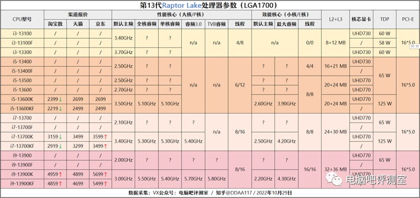 ▲ 主流第12代/第13代处理器参数及报价