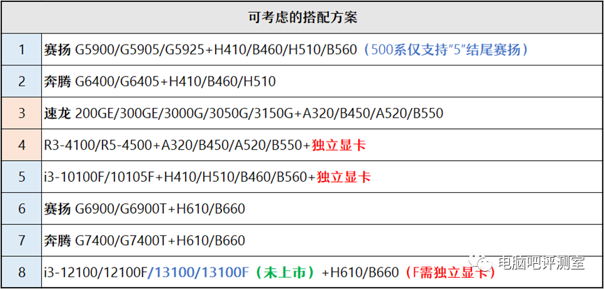 ☞ 经济型梯队:速龙200GE(Zen/Vega 3/退市)、速龙3000G(Zen+/Vega 3/退市)、赛扬G5900/5905(10代/UHD610)以及奔腾G6400/6405(10代/UHD610)等依然是该价位区间的“常客”,价格便宜且均自带入门级核芯显卡,可以满足基本Office办公、网课学习、小游戏以及日常影音娱乐需求,适合预算不高的用户选择,也可以作为升级跳板临时过渡。赛扬G6900(12代/UHD710)、奔腾G7400(12代/UHD710)自10月以来略有小跌,但得益于CPU架构优势,它们和前述型号(赛扬G5905/奔腾G6405)相比,可以获得30%以上的性能提升,基于Xe架构的UHD710核芯显卡性能表现也会更优秀,甚至超越UHD630从而轻松应对LOL等主流网游,如果搭配廉价H610,具备不错的选购价值,更适合求“新”的消费者。不管是Vega 3还是UHD610/UHD710,在搭配HDMI/DP显示输出接口的情况下最高均可输出4K分辨率画面,且支持4K超高清视频的编解码。