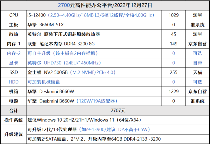 配置单推荐的处理器为i5-12400散片,你可以按照自己的预算或需求进行更换,也可以在主板更新BIOS后入手i5-13400等新U(正式版预计下月上市)。CPU散热器限高47mm,最简单的解决办法就是买个英特尔12代专用的原装散热器,i5级别建议选择铜芯款,也没有必要去买价格很贵的额散热产品,没有多少意义。