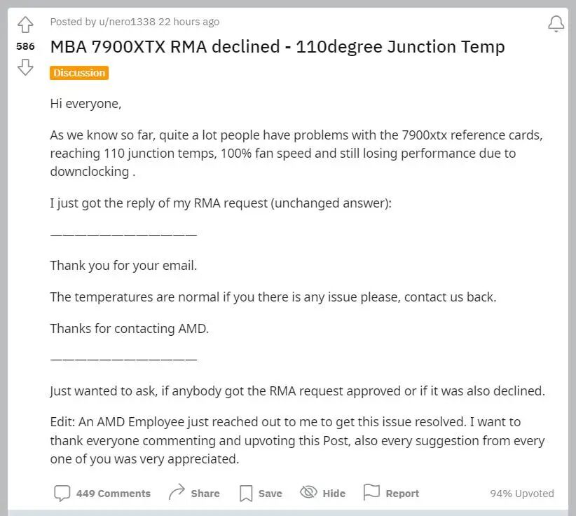 近日,一位网友在Reddit分享其发现Radeon RX 7900XTX显卡运行时的温度很高,在进行4K游戏等高负载场景之下,显卡温度很容易超过100摄氏度。该Reddit网友尝试以此为理由,向AMD官方提出了退货退款申请,不过等来的是AMD的拒绝,AMD表示对于RX 7900XTX来说这个温度是正常的。以下是这位Reddit网友发帖分享: