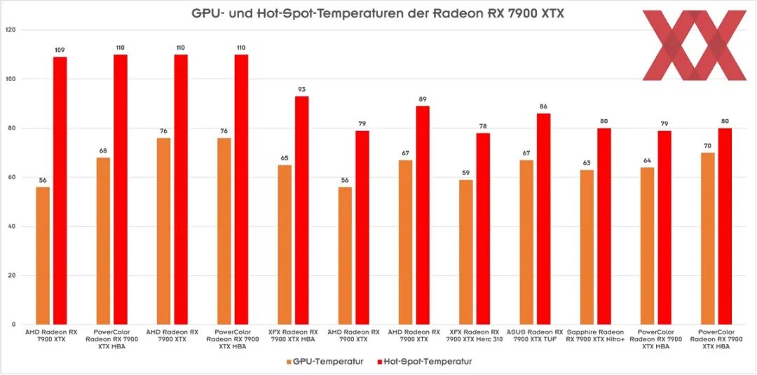 基于HardwareLuxx分享的数据显示,不少Radeon RX 7900XTX显卡温度的最热点还是在90摄氏度附近,在某些情况下甚至可以超过110摄氏度,如同CPU在高温下会降频,显卡也会因为温度过高而导致降频,从而令显卡的性能无法充分发挥出来,这么高的温度,对于玩家来说还是不太友好的。