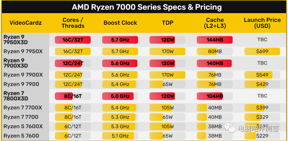 R9 7900X3D:12 核 24 线程,睿频 5.6GHz,140MB 缓存,120W TDP