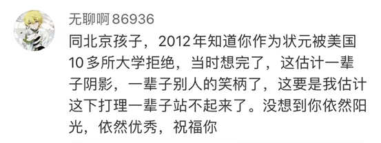 “知道你作为状元被美国10多所大学拒绝,当时想完了,这估计是一辈子阴影,一辈子成为别人的笑柄了。没想到你依然阳光,依然优秀。”