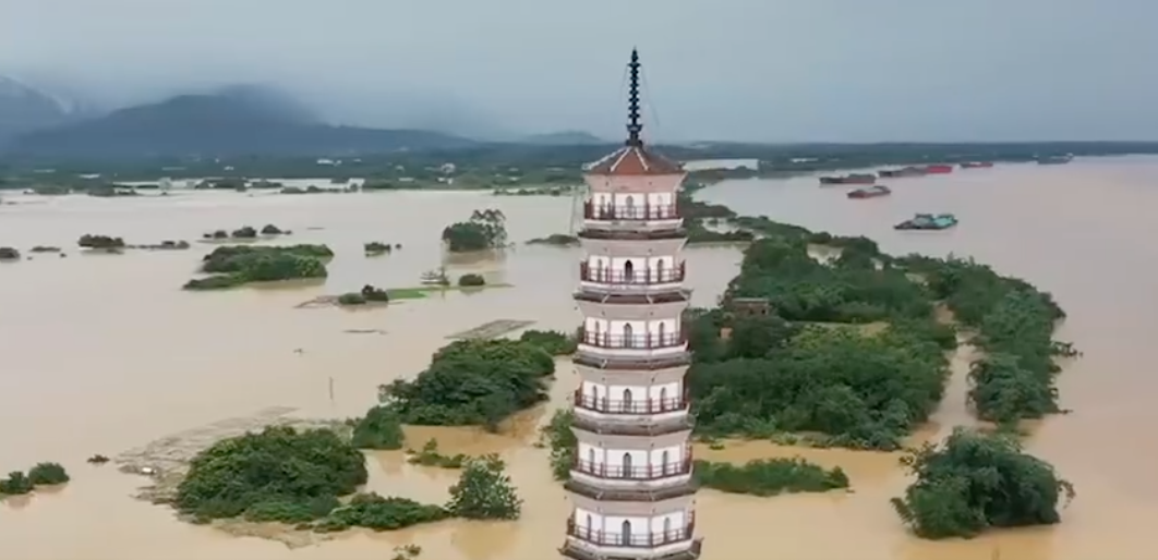 曾经繁华的古迹地标文峰塔,如今孤零零地悬在江中。