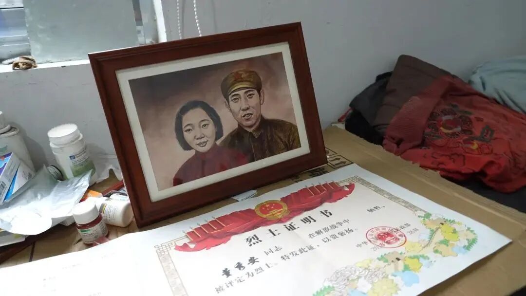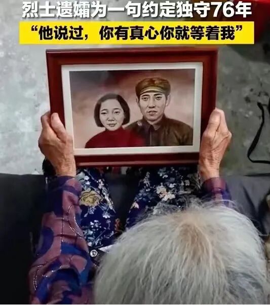 近日,微博话题 #她为了一句约定等了丈夫76年# 登上热搜,阅读量很快破亿,背后的故事感动了无数网友。7月26日,山东日照95岁的烈士遗孀陈秀英老人,收到了一份特殊的画像。丈夫身着军装,一身正气、英姿勃发,妻子梳着齐耳短发,温婉秀气。这是陈秀英和丈夫董秀安,迟到了76年的“结婚照”。1946年,董秀安和陈秀英结婚才4天就上了前线,临行前叮嘱妻子“等我回来”。即便后来知道丈夫牺牲的消息,她依然倔强地守着这个约定,足足等了76年。当年,董秀安没给陈秀英留下任何遗物,他们甚至没有一张合影。为了弥补这个遗憾,画家贾贵仟通过查询多方资料,用还原的方式,为两位老人画了一张合影。76年后,当陈秀英再次真切地看到丈夫的模样,往事瞬间如潮水般涌上心头,她噙着泪水,一遍遍抚摸画像,怎么都不愿放下。“你真的回来了,你让我真心等着,我等到95岁了。”所有看到这一幕的人,思绪都被这幅画像,牵回到了那段烽火岁月。1946年,山东莒县峤山镇黄草坡村口,一对年轻夫妻正依依惜别。丈夫叫董秀安,22岁,赶来送别的是他的新婚妻子陈秀英,18岁。那时,解放战争爆发,战火纷飞,民不聊生,年轻的董秀安毅然参军入伍。婚后第四天,他就接到了奔赴前线的命令。纵使心中万般不舍,但为了丈夫的理想,陈秀英好含泪挥手。“那时候日子苦,家里穷,当兵打仗就是为了解放全中国,老百姓一起过上好日子。”她里里外外操持着整个家,白天去地里干农活,照顾婆婆和弟弟,晚上还要纺线织布,贴补家用。丈夫在前线战斗,自己就在后方照顾好家人,夫妻齐心,总能等到团圆的那一天。期间,董秀安曾回过一趟家,但战事激烈,他不能久留。临别时,他给妻子留下一句话“等我回来”,然后急匆匆地走了。陈秀英含泪目送丈夫远去,望着他的背影坚定地点了点头。从此,董秀安便杳无音讯,没人知道他去了哪里,身在何处。在那个通讯并不发达的年代,陈秀英只能守着家,日复一日地辛勤劳作,盼星星盼月亮地等丈夫回来。终于,有人带回前线的消息,却如同晴天霹雳——董秀安牺牲了。悲痛过后,陈秀英仍然无法接受,心里一百个不相信,“我总觉得他还活着,说不定哪天就回来了”。从此,她天天站在村口,沉默无言地看着通往远方的小路,期待那个熟悉的身影出现。直到解放后的一天,县里送来董秀安的烈士证,原来他已于1946年8月在四平牺牲。也是那时,陈秀英才知道,四平战役打得极其惨烈,1946年到1948年,一共打了4次血战。最终,中国共产党领导的东北民主联军以伤亡4万余人的代价,歼灭国民党军6.8万余人,掌控了战略要地四平。而董秀安,当时正是东北民主联军某部副连长,在战争打响不久就牺牲了,没有机会看到最后的胜利。看到白纸黑字的记录,陈秀英才相信,丈夫是真的不在了。纵使内心天塌地陷,陈秀英也不能让自己垮掉。丈夫走了,还有一大家子人需要她。她强忍着悲伤,操劳着家务和地里的农活,忙到一刻都不敢停,但夜深人静时,她的思绪总会忍不住飘向遥远而陌生的四平。董秀安没有留下遗物,为了寄托思念,陈秀英亲手缝制了一双布鞋。在她脑中,还残存着一点儿美好的幻想,“有一天,他能回来,穿上我给他缝的鞋。”然而,早年间家中的一场火,将这双珍贵的布鞋烧得只剩下底儿。即便鞋底早就因为一遍遍地摩挲变得破烂不堪,但陈秀英还是把它当宝贝一样细心收藏,对她来讲,这就是一份念想、一个寄托。多年来,陈秀英始终记着当年与丈夫的约定,一个人守着家,守着那份诺言。“我就等着他,死了我也蹲家里等着他,我要对得起他。”陈秀英无儿无女,就这样拉扯着一家子,独独等候了一辈子。期间,她送走了婆婆,带大了丈夫的弟弟,后来,又担负起抚养侄子、侄女的责任。时光流逝,当初那个青涩的小姑娘,如今已变成了满头华发的老婆婆。如今,家乡的日子越过越好,但午夜梦回,陈秀英总会想起远在异乡的丈夫,千里孤坟,不甚凄凉,她最大的心愿就是让丈夫“回家”。可这么多年,陈秀英根本不知丈夫葬身何处,又去哪里找寻他的尸骨。2022年,峤山镇退役军人服务站对镇上的老兵和烈属进行走访,了解到陈秀英的故事。“看不到他,就是看一看他坟上的土也好啊!”陈秀英的话让在场所有人眼眶发红,大家都想帮助老人实现心愿。通过查询中国烈士网和烈士名录,工作人员了解到,董秀安已经被安葬在吉林省四平烈士陵园,正是他当年牺牲的地方。峤山镇退役军人服务站立刻将这个情况上报,并与四平烈士陵园取得联系。在多方共同努力下,董秀安烈士的遗骸终于被找到了,但因为已葬入陵园,无法再迁回老家安葬。为了宽慰陈秀英老人,工作人员在董秀安的墓地附近取了一抔土,带给陈秀英。6月6日,“董秀安烈士”终于踏上了阔别已久的旧土,回到了日思夜想的亲人身旁。这天,陈秀英特意梳洗打扮了一番,她将头发细细梳好别在耳后,换上干净的衣衫。千言万语堵在心口,竟一句话也说不出来,只是念叨着,“回来了好,回来了好”。工作人员为陈秀英播放了在四平烈士陵园取土的画面,带她看看董秀安长眠的地方。当看到英名墙上丈夫的名字,陈秀英再也无法克制自己。漫长的思念伴随着刻骨的记忆,随着眼泪喷涌而出,瞬间噙满了她深陷的眼窝。丈夫不在的日子里,唯一支撑陈秀英的,只有两人婚后的那几天的回忆。她只能一遍遍地在脑中勾勒丈夫的模样,努力记住他的样子