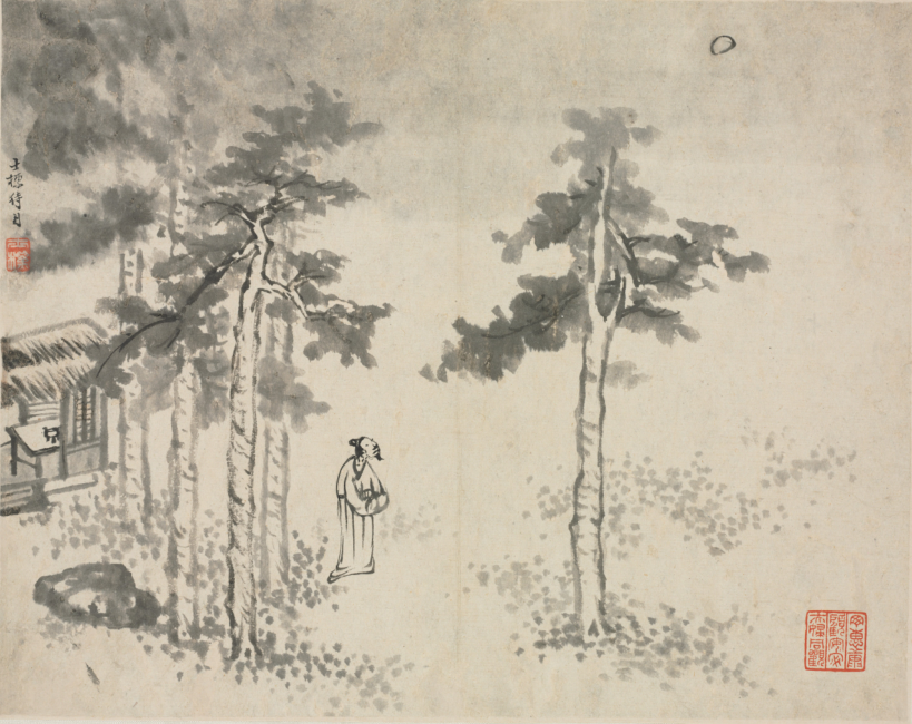 爱看古庙破苔痕,惯写荒岩乱树根。