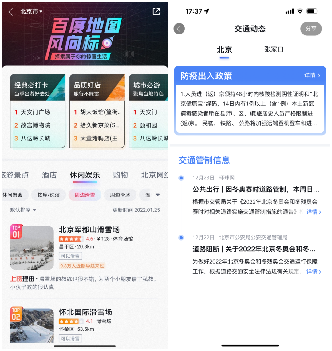 同时,冰雪赛场地图也会提供赛事期间京张两地的出入政策和道路管控等交通动态信息。针对滑雪、滑冰爱好者,全新升级的“百度地图风向标”还打造了全国冰雪游玩专题榜单,点燃冰雪激情。