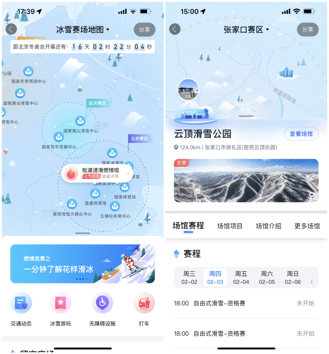 冬奥赛事相关的冰雪运动也成为不少人关注的焦点。为响应“带动三亿人参与冰雪运动”号召,百度地图特别推出“冰雪赛场地图”。只需打开百度地图APP,搜索“冰雪赛场地图”,场馆、赛事、出行等实用信息便一目了然。通过滑动或缩放浏览,即可查看不同场馆的赛程、竞赛项目等详细信息。