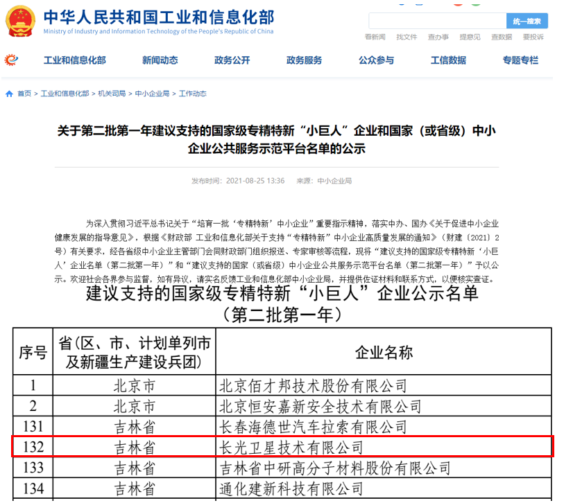 近日,根据《财政部 工业和信息化部关于支持“专精特新”中小企业高质量发展的通知》(财建〔2021〕2号)有关要求,经公司申报、省级中小企业主管部门推荐、专家审核等流程,长光卫星技术有限公司成功入选“第二批第一年建议支持的国家级专精特新‘小巨人’企业”名单。