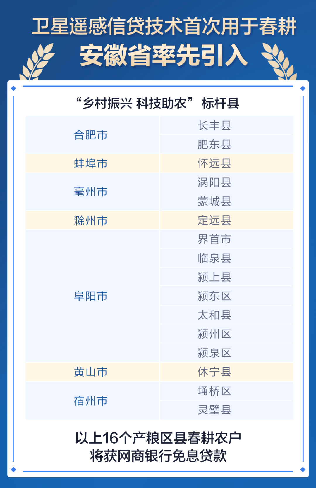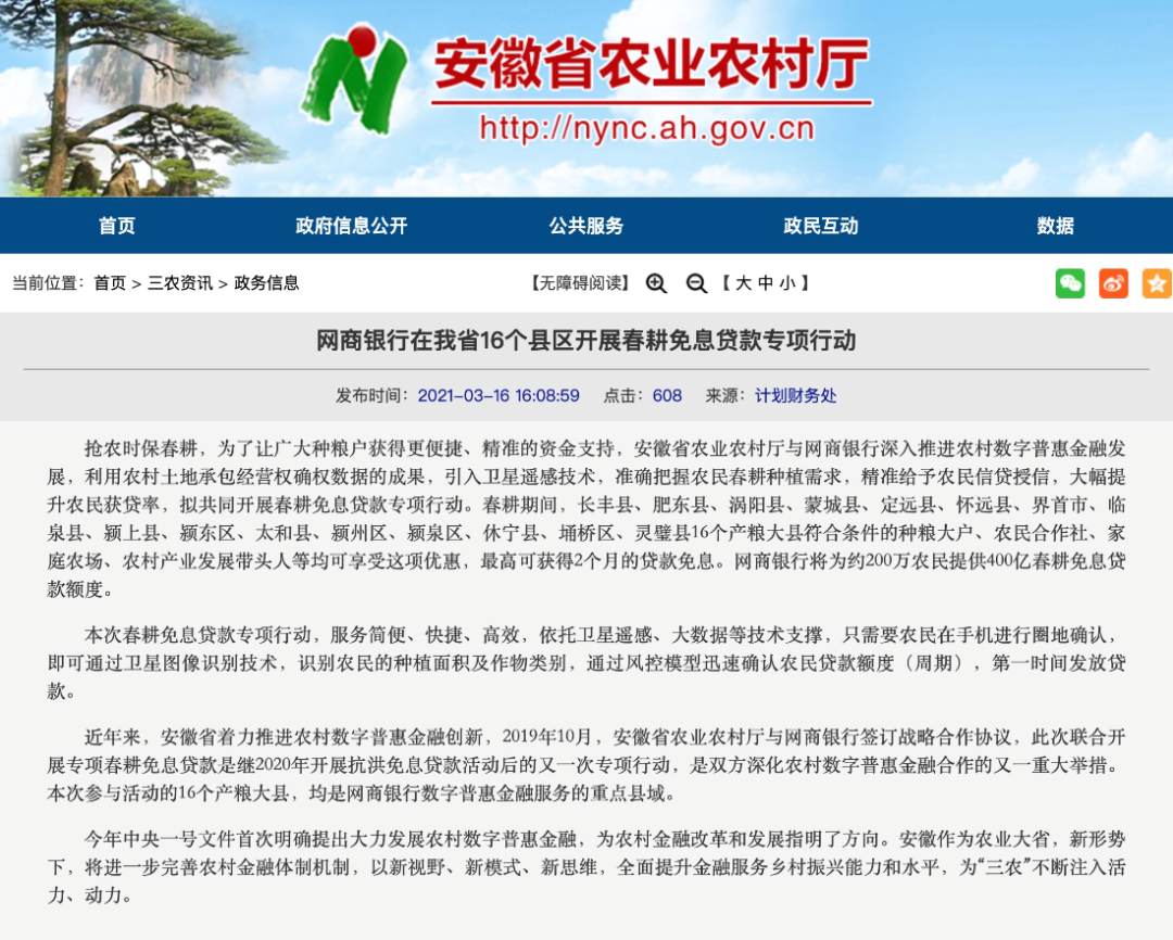 2019年10月,安徽省农业农村厅与网商银行就深化农村金融创新签订合作协议,此次安徽发放免息贷款的16个产粮大县,正是与网商银行深入合作数字普惠金融的县城。