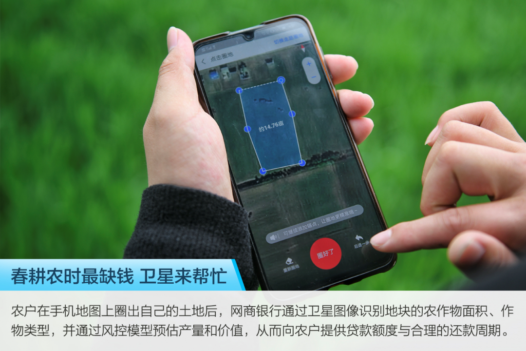这套卫星遥感信贷技术代号为“大山雀”,技术原理是农户在手机地图上圈出土地,确认自己的地块后,网商银行通过卫星图像识别地块的农作物面积、作物类型,并通过风控模型预估产量和价值,从而向农户提供贷款额度与合理的还款周期。
