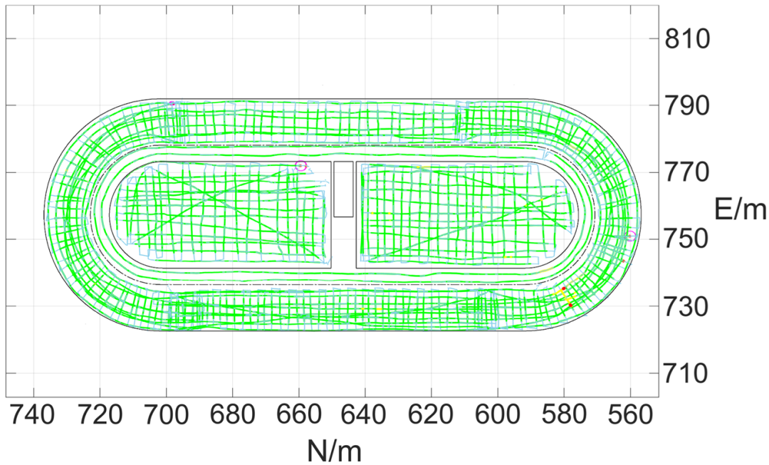 相较传统的地面平整度测量方法,深大团队研发的平整度测量机器人具有精度高、测点密、效率快、可定位、灵活性好等优点。机器人的相对高程测量精度优于0.5mm/5m,测量综合效率相较于传统水准仪法提升5-10倍,完全满足超大室内混凝土基底的平整度测量与评估需求。团队于2020年10月-12月建设期间对国家速滑馆实施了两次全面测量,总测线距离超过20km。通过施工期的测量检测出了平整度超限位置,为冰面基底在施工期的整平和打磨工作提供了参考;而竣工后的平整度测量为冰面基底质量评估和验收提供了有力的依据。国家速滑馆于2021年1月完成首次制冰,能够实现冰面温度差不超过0.5摄氏度,完全满足国际滑联速滑场馆冰面温差不得超过1.5摄氏度的要求,验证了冰面基底建设质量达到设计目标。