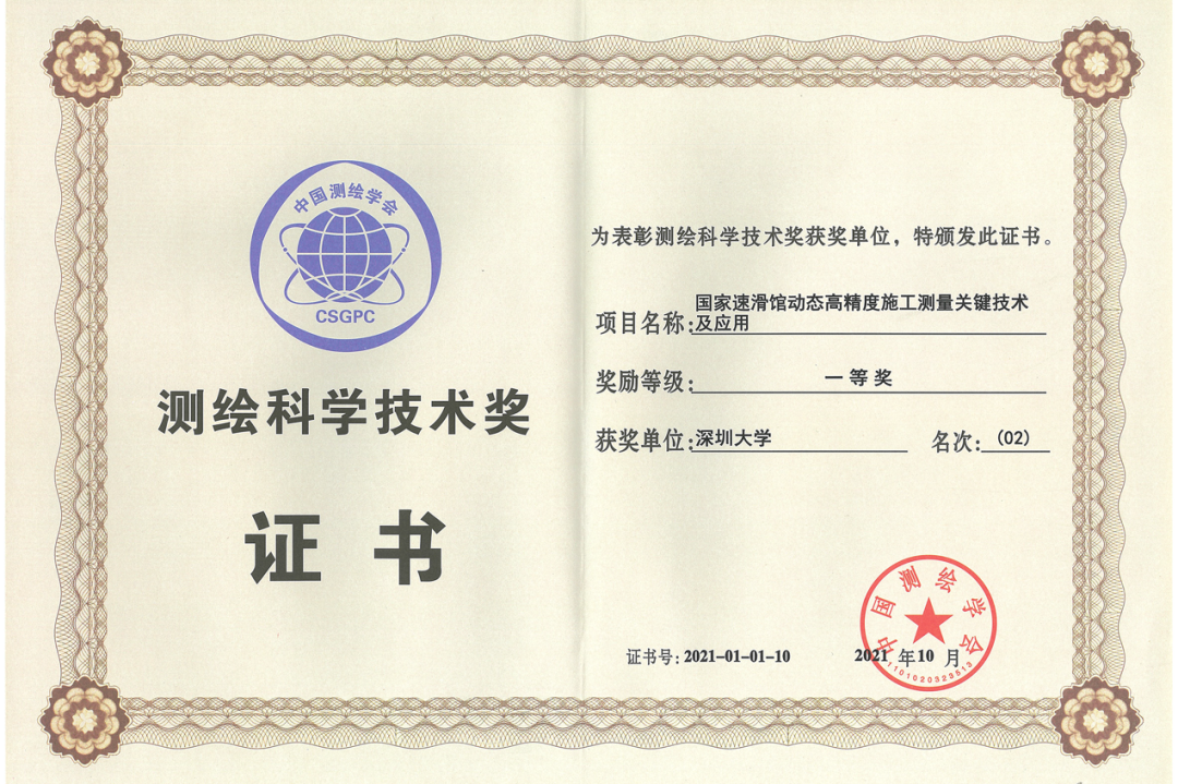 深大团队在项目实施过程中表现了出色的创新科研思维及高效精准的实践能力,获得了国家速滑馆建设相关方的认可。所参与的项目“国家速滑馆动态高精度施工测量关键技术及应用” 荣获2021年度测绘科学技术奖一等奖。