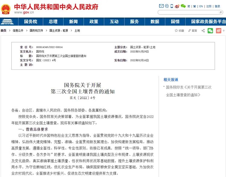 人民网北京2月17日电 (记者李楠桦)近日,国务院印发《关于开展第三次全国土壤普查的通知》(以下简称《通知》),决定自2022年起开展第三次全国土壤普查。