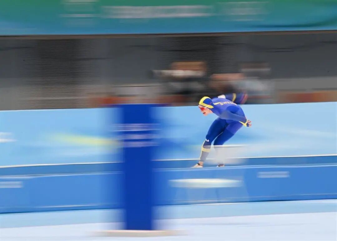 ▲瑞典选手范德普尔在“冰丝带”比赛中(新华社图)▲
