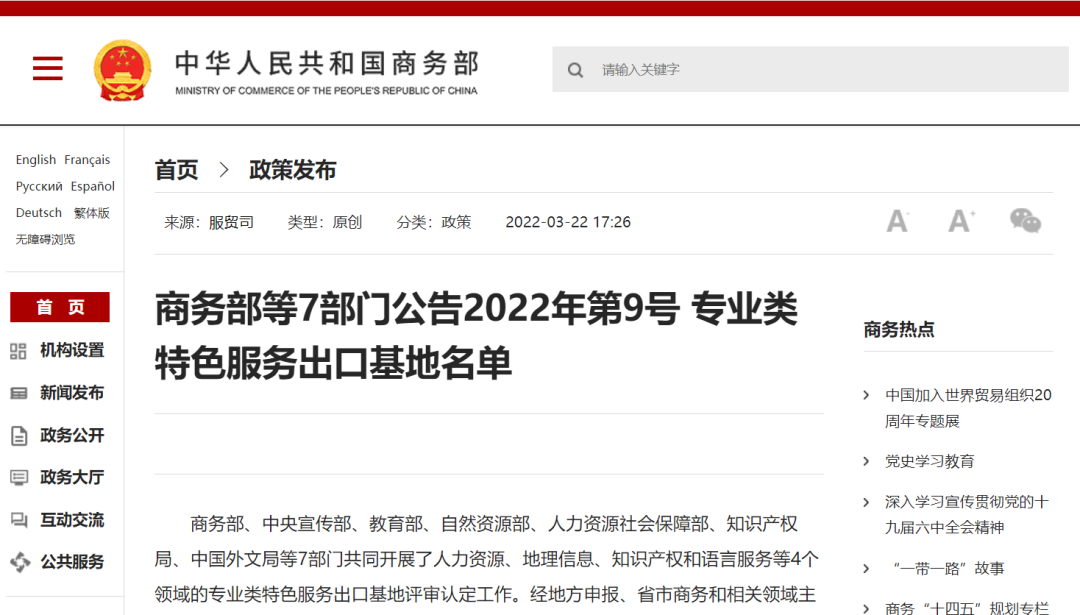 近日,商务部、中央宣传部、教育部、自然资源部等7部门发布公告,北京的中关村科技园区朝阳园、上海的中国北斗产业技术创新西虹桥基地、浙江的湖州莫干山高新技术产业开发区、湖北的武汉大学科技园及陕西航天经济技术开发区等5家园区,被列为特色服务出口基地(地理信息)。