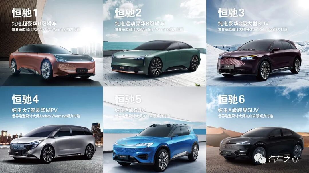 恒大的新车型,2019 年在许家印口中是「15款」。到今年 3 月恒大集团发布全年业绩时,许家印透露,「目前恒大 14 款新能源汽车中至少有 10 款是车界爆款。」也就是说,恒大最初 15 款车的造车计划已有所调整,变为「14款」。同时,在车型设计一端,最初恒大签约 15 位设计师来设计 15 款车型。实际在恒驰 1 - 恒驰 6 上,Anders Warming、Michael Robinson、丸山公顾三位设计师分担了 6 款车的设计。这样的调整有其合理性,规模化造车讲求平台化与零部件通用化。尤其像恒大这样喊出 10 年内实现年产销 500 万辆,如果各个车型在设计上各自为阵,那在研发与制造端想要控制成本,非常困难。据恒大新能源汽车体系一位工程师向汽车之心表示,当前恒驰 1 - 恒驰 6,均系概念车。这些车型在量产发布时,将会确定正式的命名。这 6 款车是第一批,恒大内部还有 8 款车正在研发中。