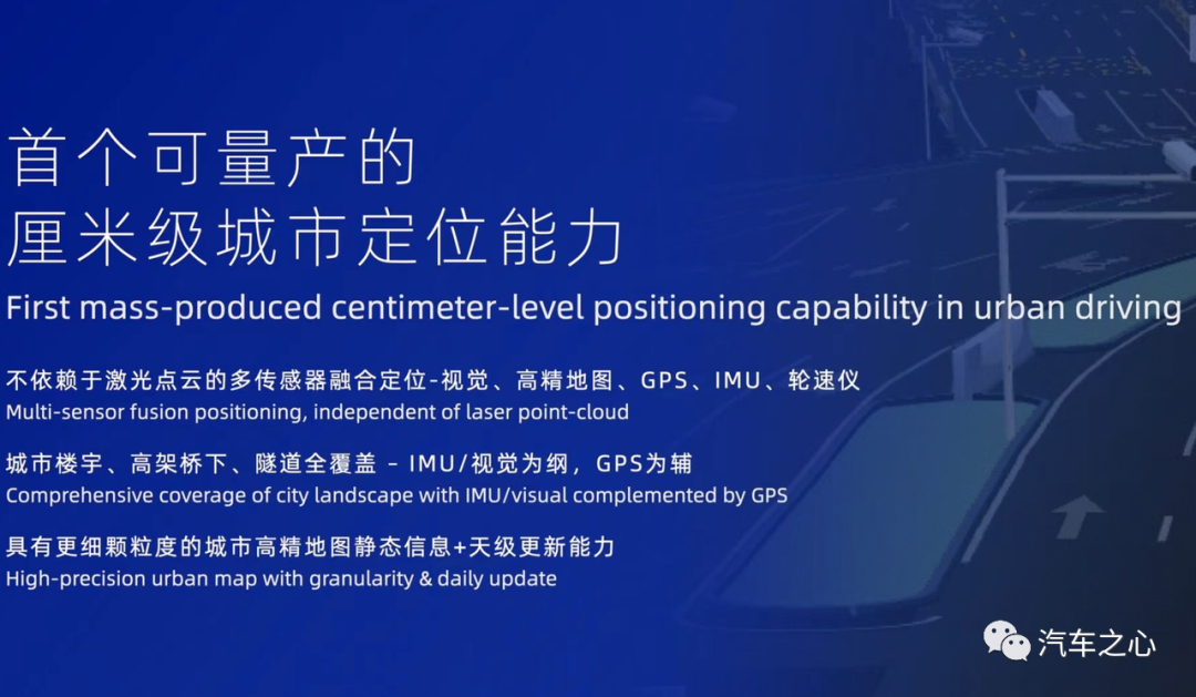 2)厘米级城市定位能力:基于视觉、高精地图、GPS、IMU、轮速仪的多传感器融合定位,城市定位精度达到厘米级。同时,具备更细颗粒度的城市高精地图静态信息+天级更新能力。
