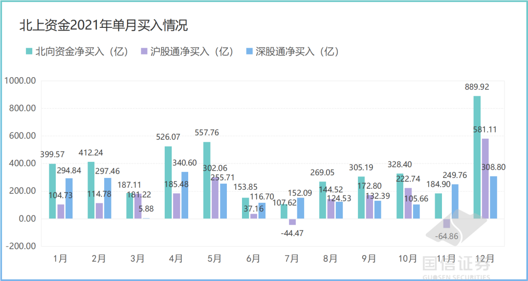 按月来看,2021年以来北上资金保持了对A股的单月连续净买入,其中,2021年12月北上资金净买入890亿元,创北上资金单月净买入历史新高。