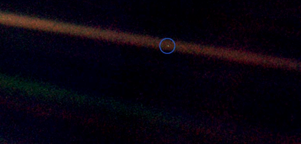 再看看那个光点,它就在这里。 那是我们的家园,我们的一切。 你所爱的每一个人,你认识的每一个人,你听说过的每一个人,曾经有过的每一个人,都在它上面度过他们的一生......... 人类历史上的每一个圣人与罪犯,都住在这里——一粒悬浮在阳光中的微尘。