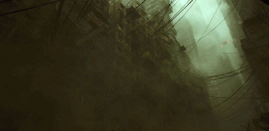 飞行器从阴暗潮湿的街区一路向上。