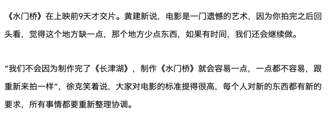 《水门桥》更是在上映前9天,才交上剪辑好的成片,制片黄建新有些不甘心地说,“电影是一门遗憾的艺术......如果有时间,我们还会继续做。”