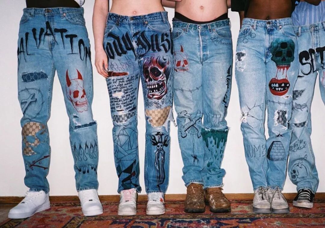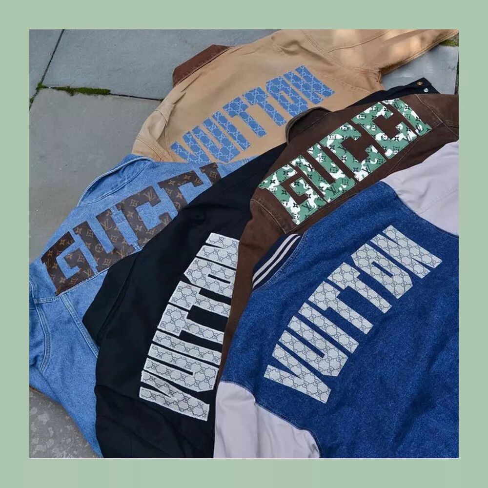 Etai Drori是非常著名的Bootleg设计师,他善用把奢侈品牌的Monogram解构,然后重新设计单品,各种保护套都在他的范畴之内。留下了经典LV双肩包的廓形和配件,将DIOR和GUCCI的帆布拼接上去,比光买一只LV双肩包造价更贵。近日碧梨与Bootleg鼻祖Dapper Dan(已被GUCCI招安)见面时穿的那件LV马甲是出自于品牌VANDY之手。VANDY是Bootleg届里面较为知名的品牌了,而且还经常活跃于线下,举办pop-up store这类的活动。风格相对比较简约、统一,善用老牌奢侈品的Monogram元素,再塑经典。与前两者不同,碧梨另外选择的bootleg品牌kokiko善用奢侈品牌面料去填充各种服饰做拼接,成为图案的一部分。裤腿上破洞中的Monogram