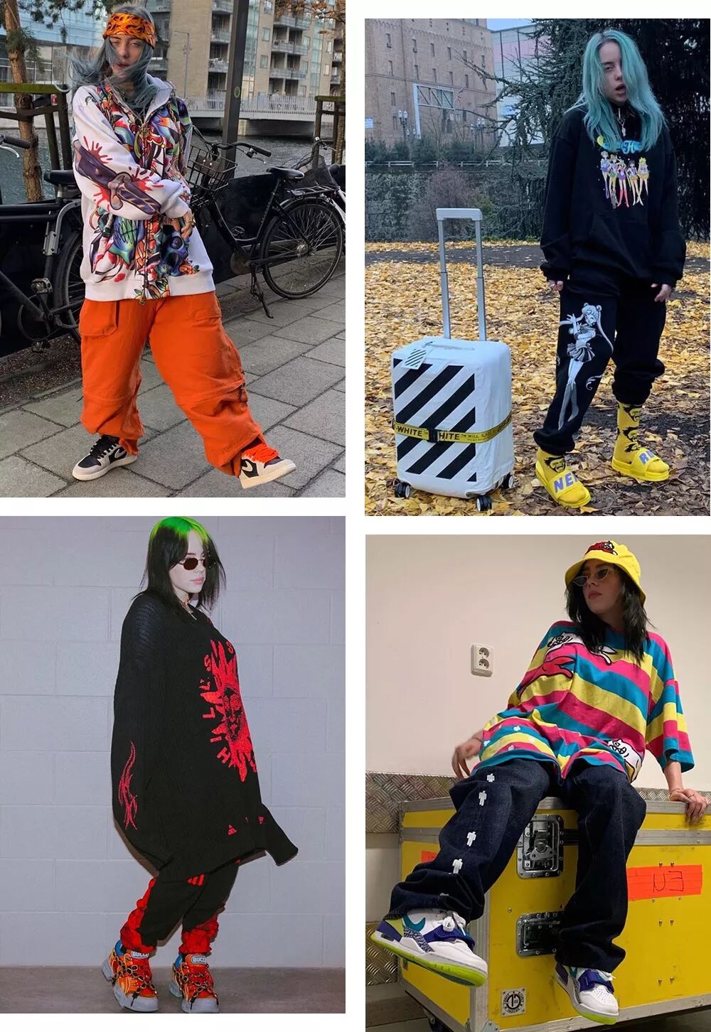 她钟爱洛杉矶品牌Freak City,舞台表演的服装基本被他家承包。碧梨还与Freak City进行了联名,以她热爱的荧光色系打造一系列涂鸦套装,可以说是非常“碧梨风”了。除了涂鸦之外,Freak City还酷爱运用美式文化以及欧洲文艺复兴时期的宗教元素,混合融汇出一种看似十分cult的感觉。同样来自洛杉矶的品牌Left Hand则比Freak City更为夸张,将Z世代(1995-2009年出生的人)所接触的流行文化都运用在服装设计上,诸如Club Culture、Vintage Tee等等,和碧梨简直是一拍即合。这个品牌经常会从动漫人物上汲取灵感,如碧梨的这套灵感来自于Jessica Rabbit。碧梨对动漫人物的爱真的不少,像什么飞天小女警、美少女战士统统穿上身。设计这些正是个人艺术家Slumpykev,最擅长将“二次元”灵活的穿在身上。今年碧梨也出席了Coachella,玩的特别high。 服装上的印花尤为亮眼,来自品牌BOND。同样喜欢用涂鸦以及主题绘画,但是BOND的整体风格更倾向于Punk、Grunge这样的摇滚色彩。上衣来自BOND