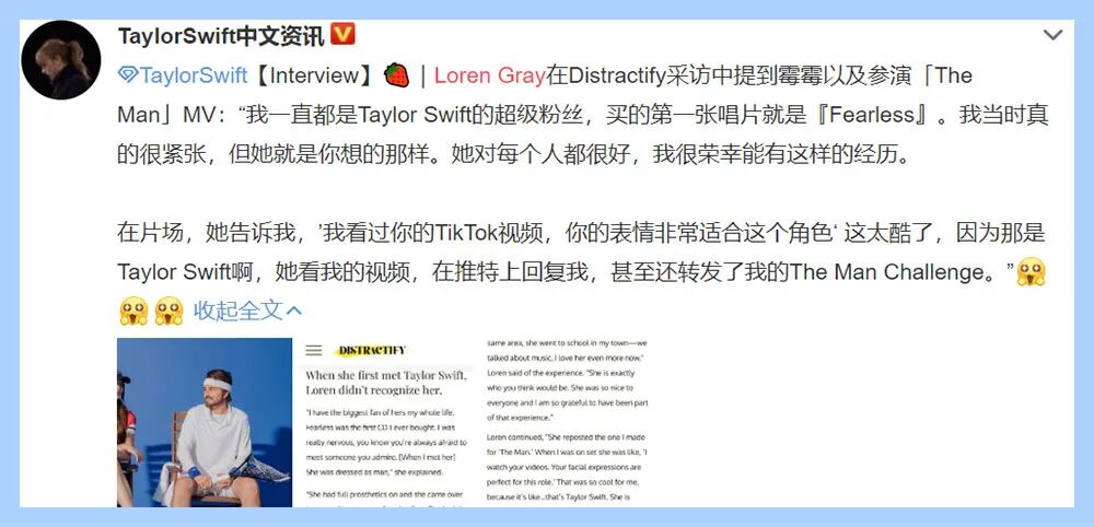 出演了MV之后Loren还激动的在ins发文感谢霉霉。