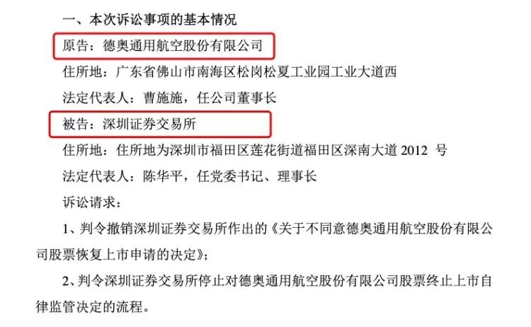 值得注意的是,6月15日,德奥退同时发布另一份公告:近日,公司收到深圳中院送达的《广东省深圳市中级人民法院受理案件通知书》,诉讼请求为判令撤销深圳证券交易所作出的《关于不同意德奥通用航空股份有限公司股票恢复上市申请的决定》;判令深圳证券交易所停止对德奥通用航空股份有限公司股票终止上市自律监管决定的流程。