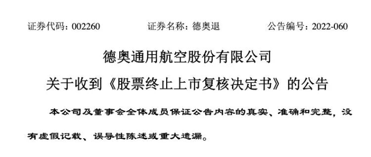 6月15日,公司收到深交所《股票终止上市复核决定书》,根据深交所《上诉复核委员会工作细则(2020年修订)》第四条的规定,深交所作出维持《关于德奥通用航空股份有限公司股票终止上市的决定》(深证[2022]399号)对德奥通用航空股份有限公司作出的股票终止上市决定。本决定为终局决定。