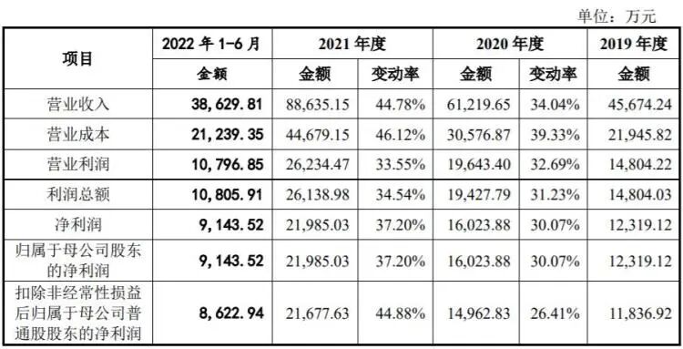 招股说明书显示,矩阵股份主营业务收入主要来自于空间设计与软装陈设业务收入,报告期内(2019年、2020年、2021年和2022年1-6月),公司营业收入分别为4.57亿元、6.12亿元、8.86亿元和3.86亿元;净利润分别为1.23亿元、1.60亿元、2.20亿元和0.91亿元,总体呈现持续上升趋势。