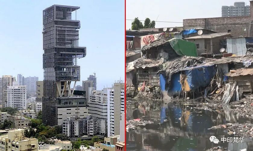 (孟买印度首富的私家摩天大楼和附近的平民窟形成了鲜明对比)