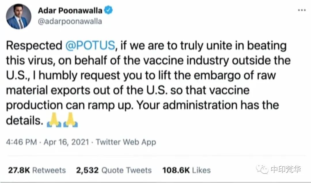 (2021年4月16日,印度最大疫苗生产公司印度血清研究所CEO发推恳请美国允许疫苗原料出口)
