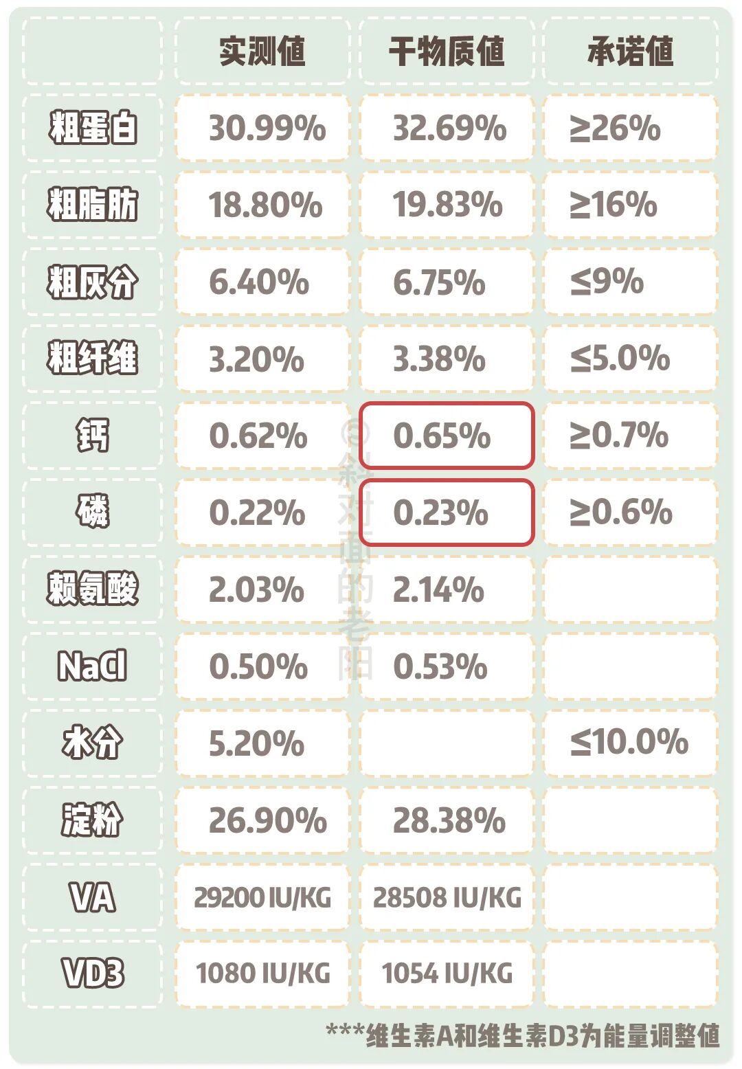 ➖ 粗蛋白实测dm32.69%,粗脂肪实测dm19.83%,乍一看还行,都符合承诺值...但别忘了,它可是添加了豌豆蛋白!!