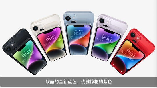 iPhone 14 蓝色、紫色、午夜色、星光色、红色