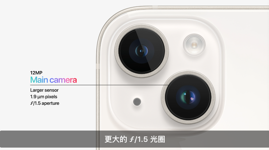 iPhone 14 /14 Plus仍旧是对角双镜头,主镜也还是1200万像素,但传感器大了,单个像素1.9微米,光圈到了f/1.5,大光圈除了能更好的虚化背景,还有提升进光量的作用。